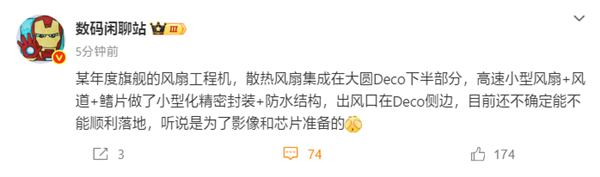 据悉,华为Mate 80系列的散热风扇集成在大圆Deco下半部分,高速小型风扇+风道+鳍片做了小型化精密封装+防水结构,出风口在Deco侧边。